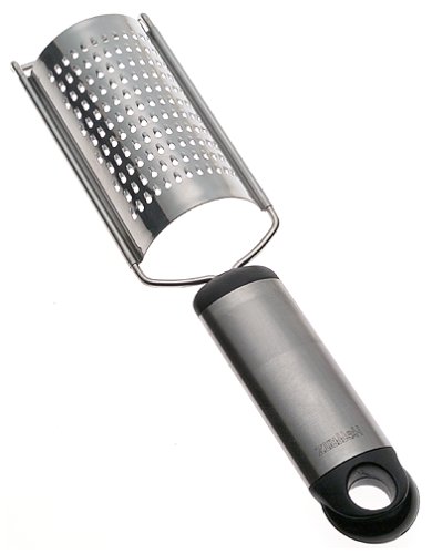 Grate cheese and spices without worrying about the mess. This curved grater ensures that the finished product falls in one area, not all over the counter. Its stainless-steel graters are strong, sharp, and handle the harder of the many cheeses and spices, and its grater holes are small--perfect for sprinkles of Parmesan on pasta, or nutmeg on eggnog. Offering a comfortable and weighty steel and plastic handle, as well as an 18/8 steel grater at the top, this product is rust-free and dishwasher-safe. --Madeleine Miller